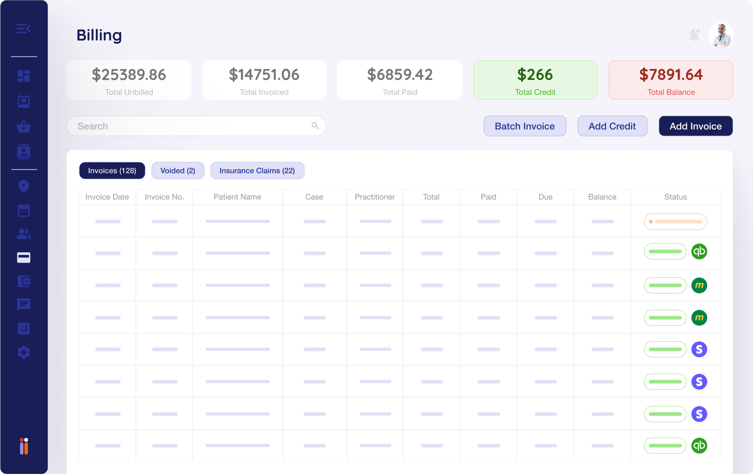 Easily generate invoices, process insurance claims, manage payments, and track payment status, balances, and claims within a unified system.
